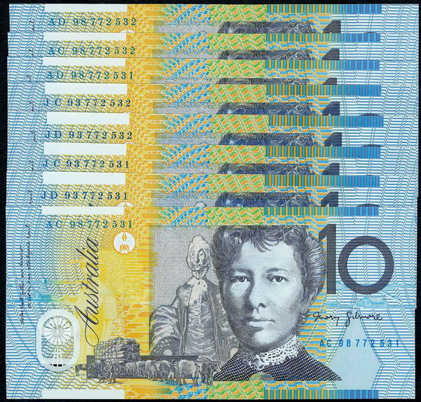 | Description: 1993/1998 ANDA Blue and Grey Tenners set of 4 polymer notes; 1993 Fraser-Evans and 1998 MacFarlane-Evans with matching serials, consecutive sets JC/JD 93 and AC/AD 98 772531/2. Notes only, missing folders. (8 notes total). UNC |