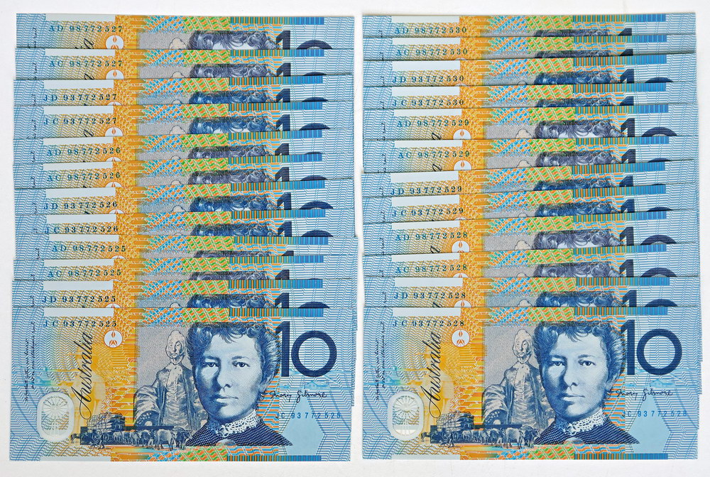 | Description: 1993/1998 ANDA Blue and Grey Tenners set of 4 polymer notes; 1993 Fraser-Evans and 1998 MacFarlane-Evans with matching serials, six consecutive sets JC/JD 93 and AC/AD 98 772525-30. Notes only, missing folders. (24 notes total). UNC |