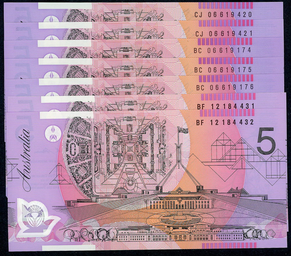 2006 polymer MacFarlane-Henry (R 220d). Consecutive trio and a pair. Also 2012 Stevens-Parkinson (R 222a). Consecutive pair. (7 notes total).