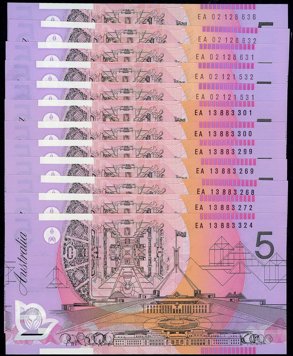 | Description: 2002 polymer MacFarlane-Henry EA 02 (R 220aL). Two consecutive pairs and a single and 2013 Stevens-Parkinson EA 13 (R 222bL). Consecutive trio, pair and 2 singles. (10 notes total). UNC |