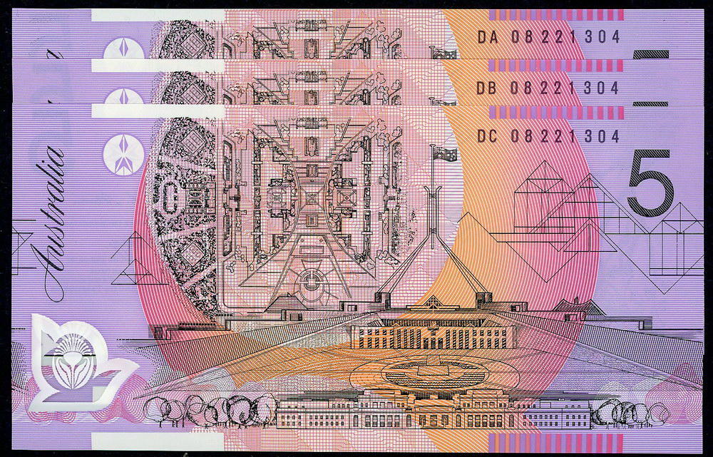 | Description: 2008 polymer Stevens-Henry (R 221b). Trio of consecutive prefix notes with matching serials; DA/DB/DC 221304. Slightly curled. (3 notes total). UNC |