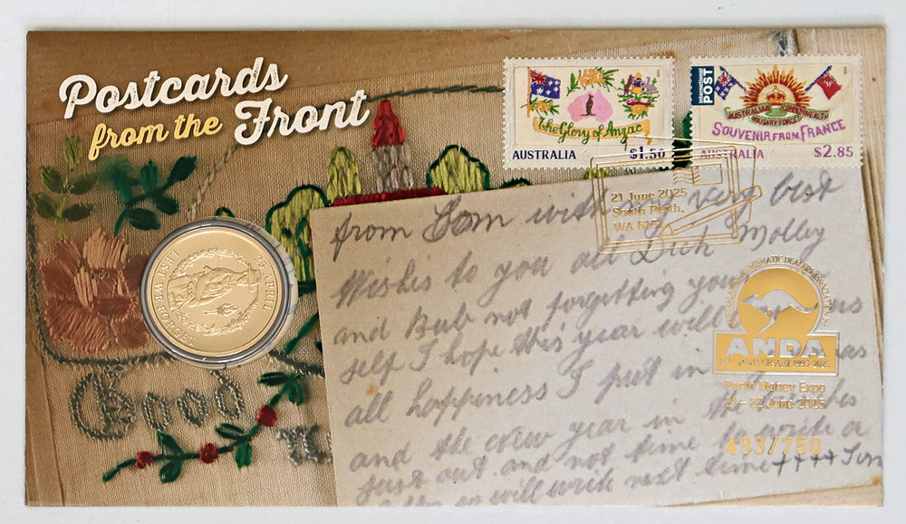 2025 ANDA Perth 30th Anniversary of ANDA First Day Cover; Postcards From the Front. Limited edition numbered and overprinted 1 Dollar issue (493/750).