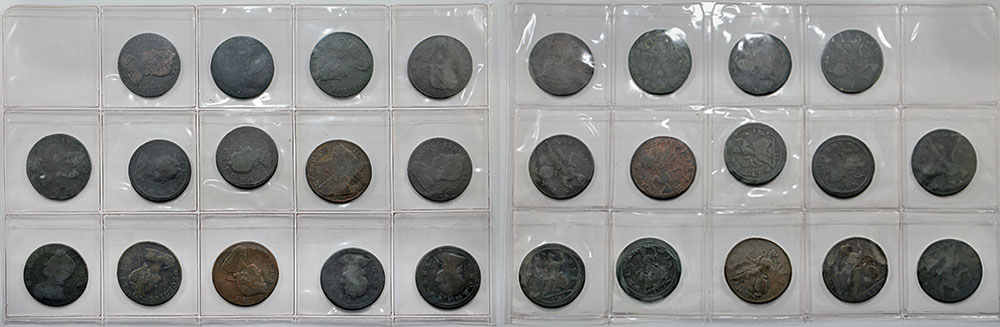 1720, 1721, 1723, 1724 George I, 1730, 1731, 1732, 1733, 1734, 1735, 1736, 1737, 1738, 1739 George II. Last cleaned. (14 coins total).