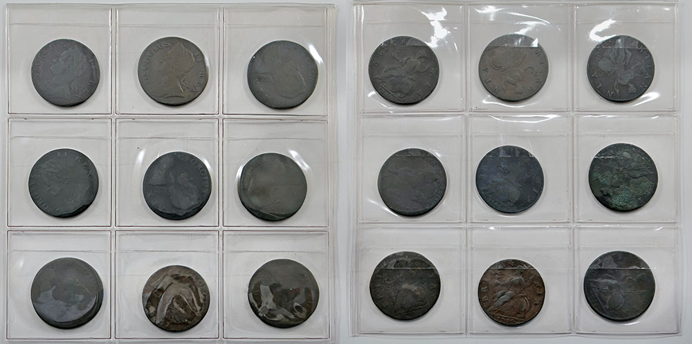 1740, 1742, 1743, 1744, 1745, 1747, 1749, 1750, 1751 George II. Mostly worn. (9 coins total).