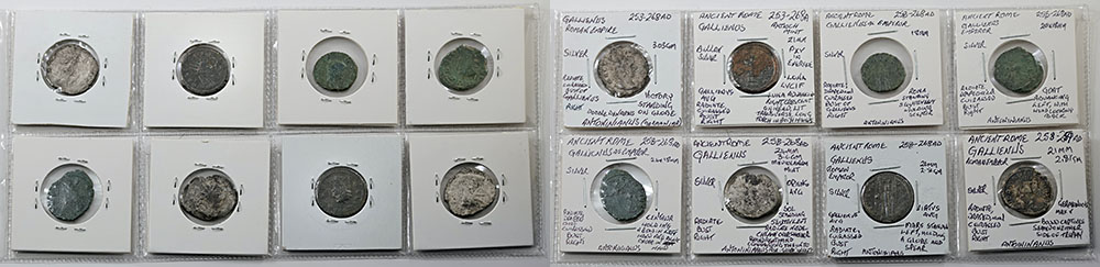 | Description: Ancient Rome Imperial billon silver Gallienus Antoninianus, assorted varieties (253-268AD); Victory, Luna, Centaur, Roma, Goat, Sol, Virtus and Germanicus Reverses. Most dark toned, some pitted. (8 coins total). G-VG |