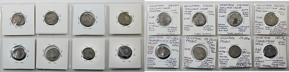 | Description: Ancient Rome Imperial billon silver Gallienus Antoninianus, assorted varieties (258-268AD); Trampling Enemy, Captives (2; one fractured), Virtus Reverses; Salonina (wife of Gallienus) (267-268AD), bust/eagle, Probus (276-282AD) bust/standing facing Jupiter, and Carinus tetradrachm (283-285AD) bust/Elpis. Most toned, some pitted. (8 coins total). G-VG |
