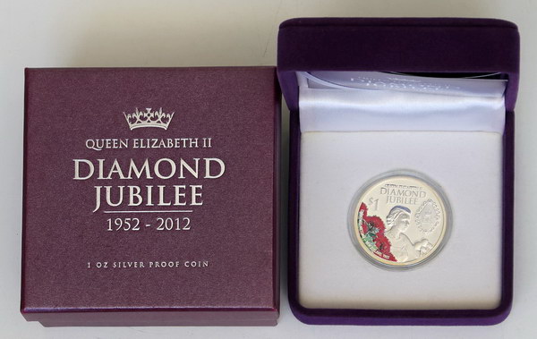 New Zealand 2012 QE II Diamond Jubilee coloured 1 oz silver Proof. In RBNZ case of issue with COA.