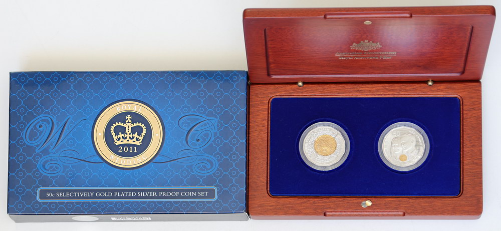 2011 Royal Wedding selectively gold-plated silver Proof 50 Cent 2-coin set. In wooden case with box of issue and COA.