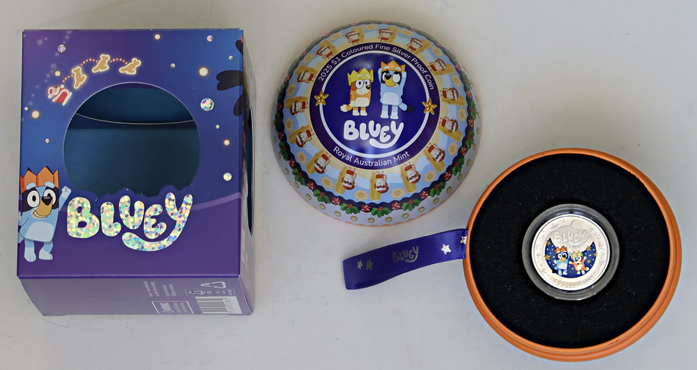 2025 Bluey Christmas bauble coloured silver Proof 1 Dollar. In pack of issue. A popular issue, retails for $500 or more.