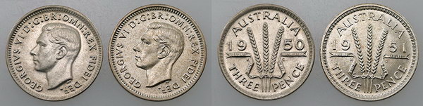 Threepence. 1950, 1951PL. Light tone with...