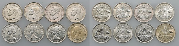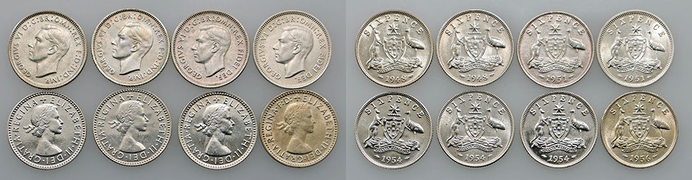 Sixpence. 1951, 1953. Some tone with bloom. (2...