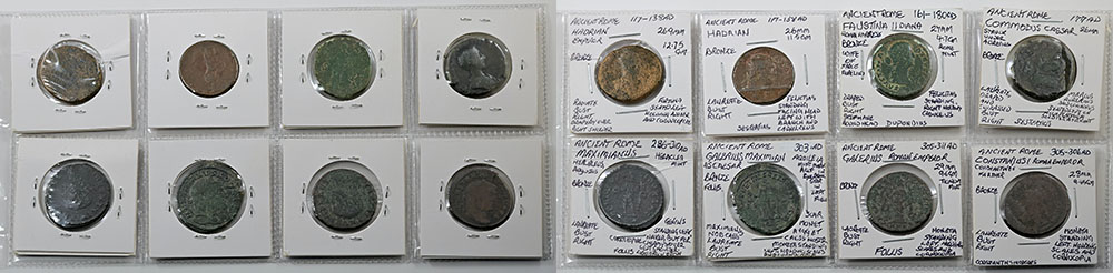 | Description: Ancient Rome Imperial bronze: Hadrian (117-138AD) bust/Fortuna (cleaned), Hadrian sestertius (117-138AD) bust/Felictius (cleaned), Faustina/Diana (161-180AD) bust/Felicitas, Commodus (177AD) bust/Aurelius and Commodus, Maximianus (286-310AD) bust/Genius, Galerius Maximian (303AD) bust/Moneta, Gelerius (305-311AD) bust/Moneta and Constanius I (305-306AD) bust/Moneta. (8 coins total). G-VG |