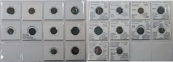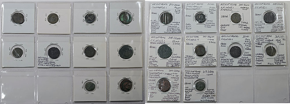 | Description: Ancient Rome Imperial bronze minors: Constantius I (293-306AD) Rev stating, Divus Romulus (309AD) Rev temple, Licinius I (308-324AD) Rev Jupiter, Rev Jupiter between eagle and crown, Rev Jupiter with Victory, Licinius II (321-324AD) Rev Jupiter standing with glove and captives, Rev Jupiter standing, Constantine I 307-337AD) Rev Military dress, Rev Jupiter standing (cleaned) and Maximianus (posthumous) (317-318AD). Pitted. (11 coins total). G-VG |
