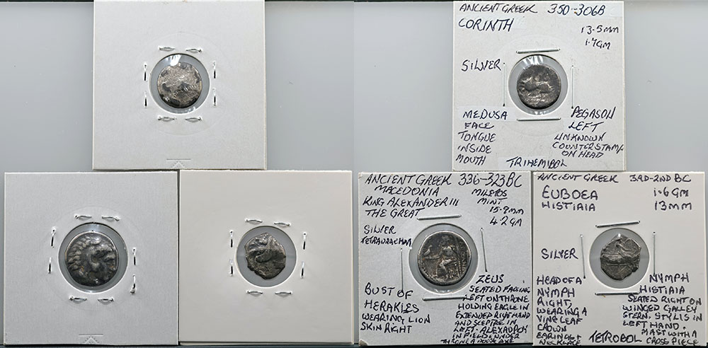 | Description: Ancient Greece silver minors: Corinth trihemibol (350-306BC) Medusa/pegasou (13.5mm), Macedonia Alexander III (336-323BC) tetradrachm Heracles/Zeus (16mm) and Euboia Histaia tetrobol (3rd-2nd C BC) Nymph head/Nymph Histaia on Galley (13mm). (3 coins total). VG-aFINE |