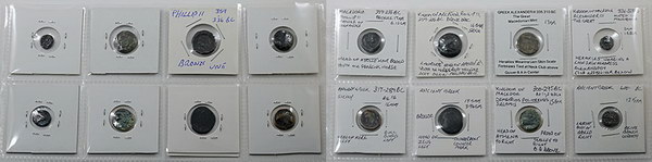 | Description: Ancient Greece, Macedonia bronze minors 3rd Century BC: Philip II (359-336BC) Apollo/Youth on horse (17mm), Apollo/horse and thunderbolt (16.5mm), Alexander III (335-310BC) Herakles in lion skin/quiver and BA (17mm), (336-323BC) Herakles in lion skin/club and quiver (11mm), Sicily (317-289 BC) Kore/bull (16mm), Greece Zeus/thunderbolt (20mm), Macedon Demetrios (300-295 BC) Athena/Galley prow (16mm) and Greece (c400BC) Apollo/olive branch (12mm). (8 coins total). G-VG |