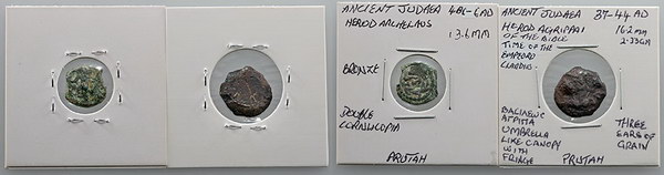 | Description: Ancient Judaea Empire bronze prutah (biblical widows mite): Herod Archelaus (4BC-6AD) Obv: double cornucopia, Rev: unknown. Struck during the time of Christs birth (edges cut, 13.6mm) and Herod Agrippai (37-44AD). Obv: umbrella, Rev: three ears of grain (16mm) cleaned. (2 coins total). G/VG |