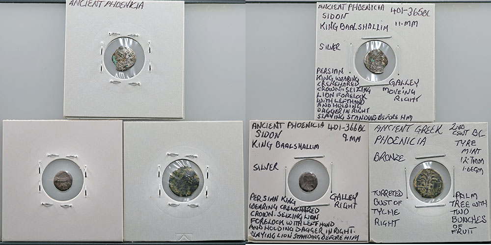 | Description: Ancient Phoenicia silver minors: Sidon King Baalshallim (401-365BC) crowned king holding lion/ galley (2 coins;11mm and 9mm) and (c 2nd Cent BC) bust of Tyche/palm tree (13mm). (3 coins total). VG-aFINE |