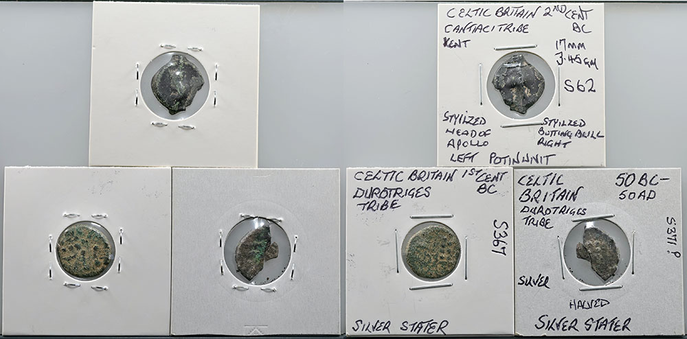 | Description: Ancient Celtic Britain potin unit Cantiaci tribe Kent (c2nd Century BC) Apollo/bull, silver Stater Durotrigues tribe (c1st Century BC) (poss S.367) and Durotrigues tribe (50BC-50AD) halved (poss S.371). (3 coins total). G-VG |