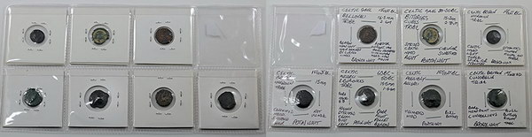 | Description: Ancient Celtic Gaul tribal bronze pontin units, 1st century BC: Aulerci Eburovices tribe (60-50BC) stylised bust/boar, unidentified helmeted head/bull, Cunobelinus tribe bare head/bull, Bellovaci tribe bearded head/rooster, Biturges Cubes tribe (80-50BC) stylised celtic head/circular epsilon and unknown tribes (2). (7 coins total). G-VG |