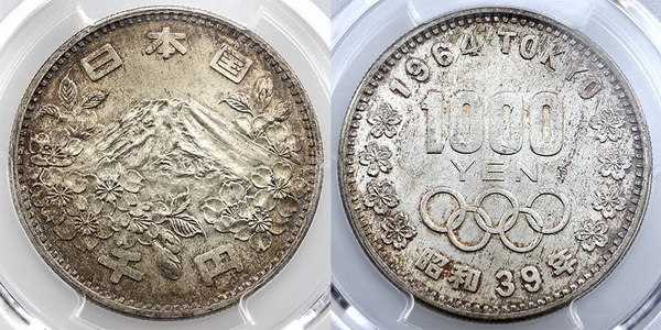 Japan 1000 Yen 1964 Olympics commemorative issue. PCGS graded MS 65 (88308509). Old toned with lustre.