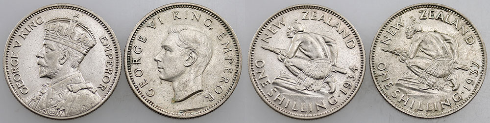 New Zealand Shilling 1934, 1937. Scratches to second. (2 coins total).