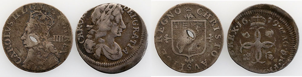 Groat hammered silver, Charles II N/D (1660-85) (holed), and hammered silver Fourpence Charles II 1679, off-centre strike. (2 coins total).