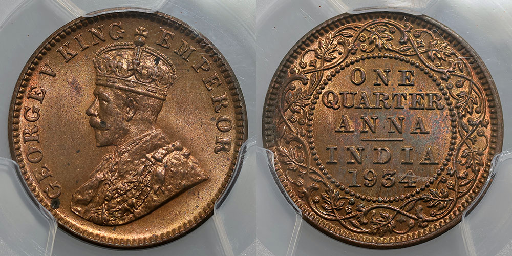 India (British) Quarter Anna 1934. PCGS graded MS 64 RD (30111674). Brown with some red.