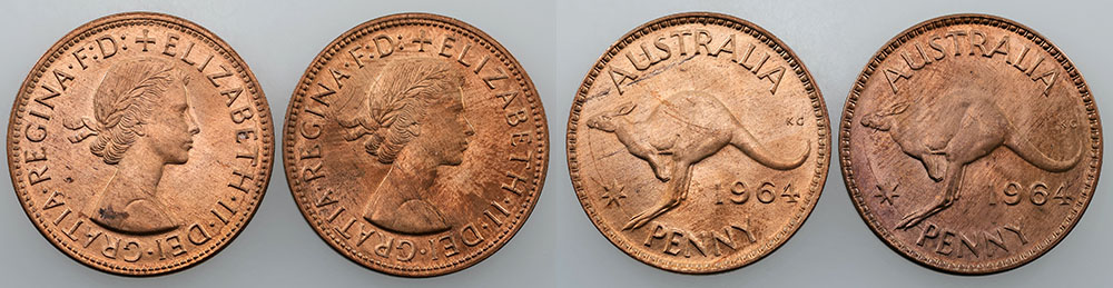 1964M. Mint red and brown to nearly full mint red. (2 coins total).