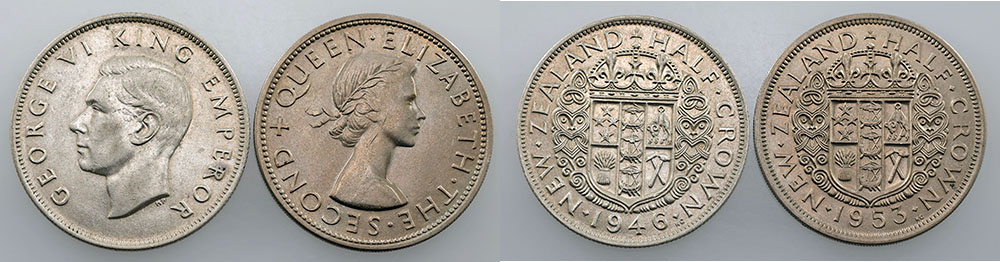 New Zealand Halfcrown 1946, 1953. (2 coins total).