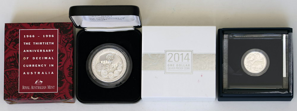 | Description: 1996 Decimal Currency 30 Years 1 oz silver Proof and 2014 MOR silver Proof Dollar. In boxes of issue with COA (environmental damage to first). (2 items total). FDC |