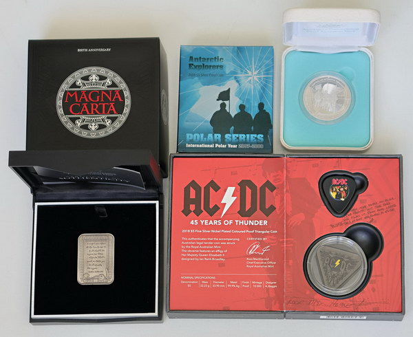 | Description: 2009 Antarctic Explorers silver Proof (36.31g), 2015 Magna Carta antiqued silver rectangular silver Unc (31.11g) and 2018 AC/DC nickel-plated coloured triangular (22.23g) silver Proof. In boxes of issue with COA (environmental damage to first). (3 items total). FDC |