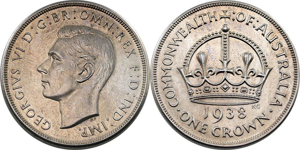 Crown. 1938. Light tone, cuts on Kings face.