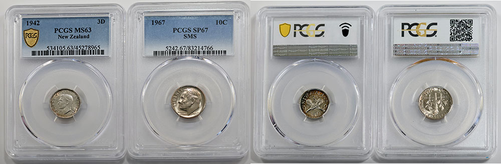 | Description: New Zealand Threepence 1942 and United States Dime (10 Cents) specimen 1967. PCGS graded MS 63 and SP 67 respectively (45278965, 83214766). Some tone to first coin. (2 coins total). Ch.UNC-GEM |