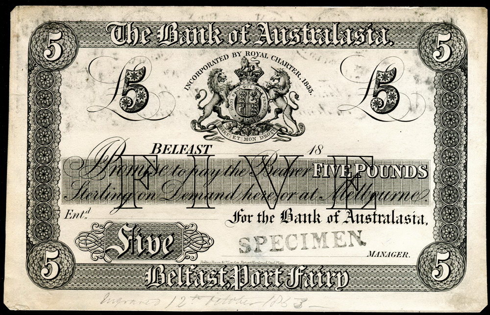 | Description: The Bank of Australasia Specimen, Belfast, Port Fairy Vic 18-- (N/D) (MVR 1b). Single sided black and white printers proof on card, stamped SPECIMEN on signature panel and with -Improved 12th November 1853- written in bottom margin in pencil. By Perkins, Bacon and Co, London. Mount marks on back, corners officially cut, a little dirty/smudged. Very rare. aVF |