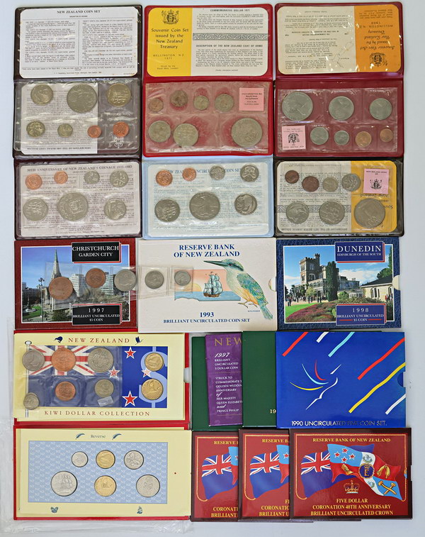 | Description: New Zealand Unc sets: 1963 (no pack), 1964 (no pack), 1969, 1971 (sticky), 1977, 1981, 1983, 1988 vinyl folders, 1990 (2), 1993, 1994 (2), 1997 Mint sets in RBNZ packs, 1990 $1/$2 2-coin and note set and 5 Dollar Unc coins in packs 1993 (3), 1997, 1998. (20 items total). UNC |