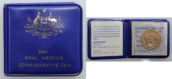 | Description: 1981 Charles and Di Royal Wedding gold Unc 200 Dollar (10g/22ct). In vinyl RAM pack of issue. UNC |