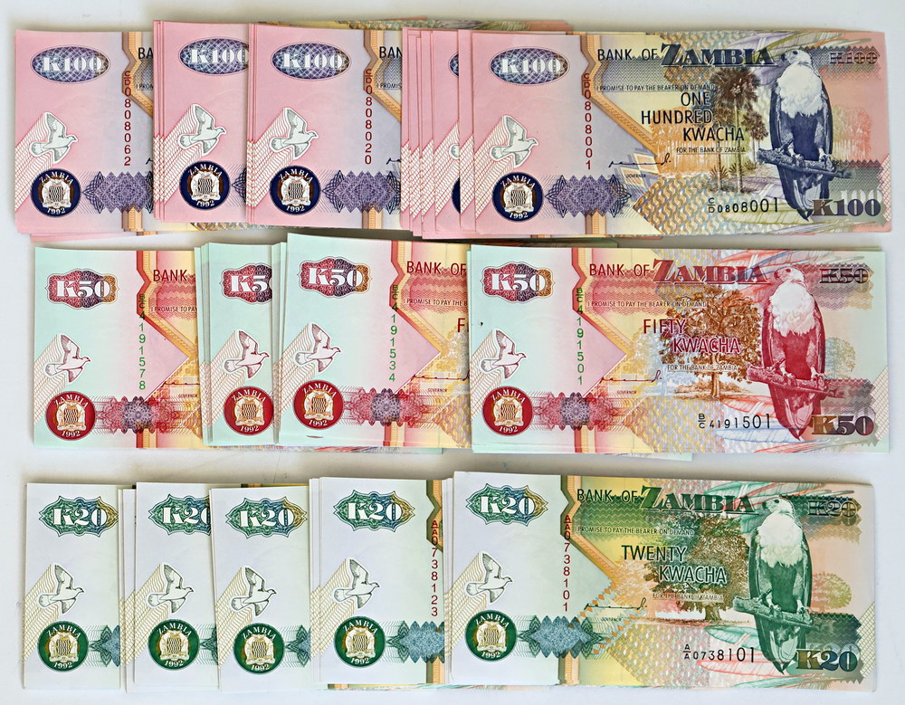 | Description: Zambia 20, 50 and 100 Kwacha 1992 (P 36, 37, 38). Consecutive bundle of 100 of each. The 100 Kwacha bundle includes repeater serials 0808080 and 0808088. Catalogues at $925USD. (3 items total). UNC |