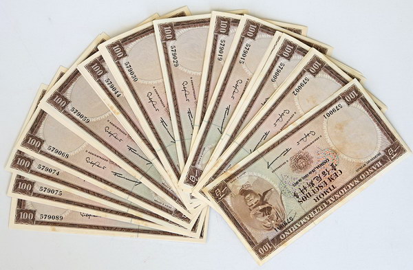 Timor 100 Escudos 1963 (P 28). Part bundle of approx 95. Light water stains, wave. High catalogue value.