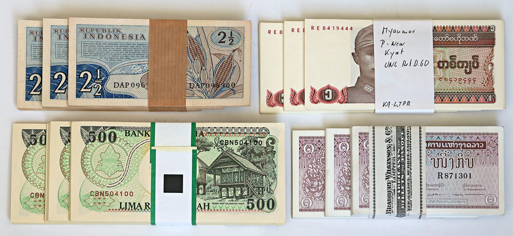 | Description: Laos 1 Kip (P 8) bundle of 99 (with Bradbury, Wilkinson and Copper wrapper), Myanmar 1 Kyat (P 67) part-bundle of 50, Indonesia 2.5 Rupiah 1961 (P 79) bundle of approximately 100 and Indonesia 500 Rupiah 1992 (P 128a) bundle of approximately 100. (4 items total). UNC |