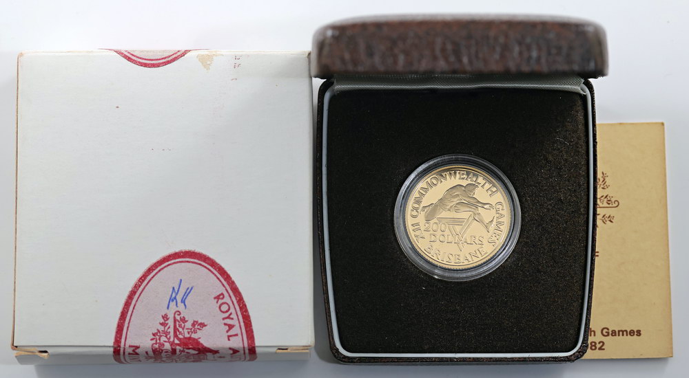 | Description: 1982 Commonwealth Games gold Proof 200 Dollar (10g/22ct). In RAM case of issue with COA and outer box (minor marks to case). FDC |