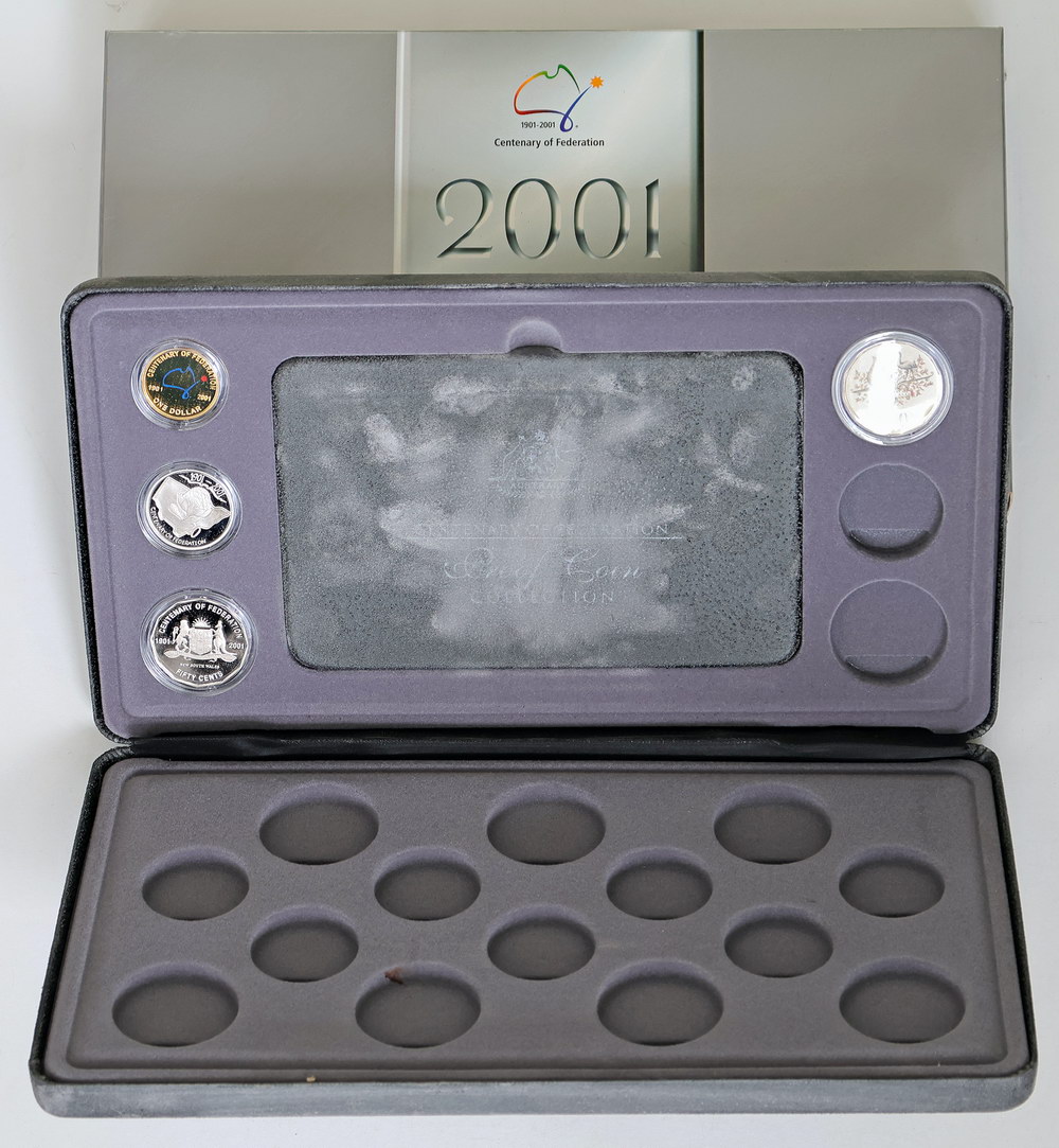 | Description: 2001 Centenary of Federation Proof set, Initial release. NB: ONLY includes: Includes WA 20 Cent, COA coloured and NSW 50 Cent and coloured 1 Dollar. In case of issue with cover and COA (environmental damage to case). FDC |