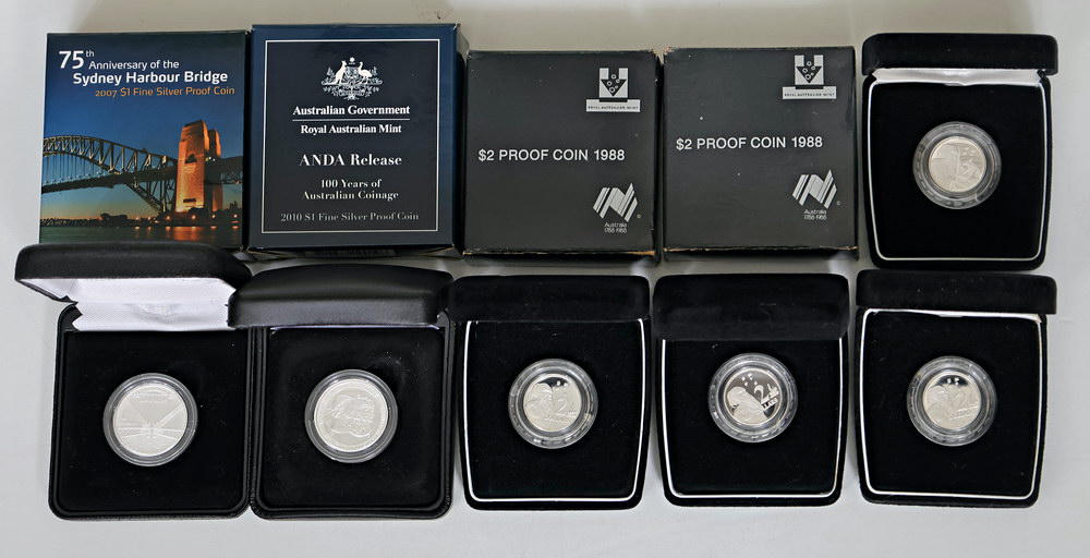 | Description: 1988 silver Proof 2 Dollar issues (4; 2 missing boxes). Also 1 Dollar 2007 Sydney Harbour Bridge and 2010 ANDA 100 Years Australian Coinage silver Proof 1 Dollars in boxes of issue. (6 items total). FDC |