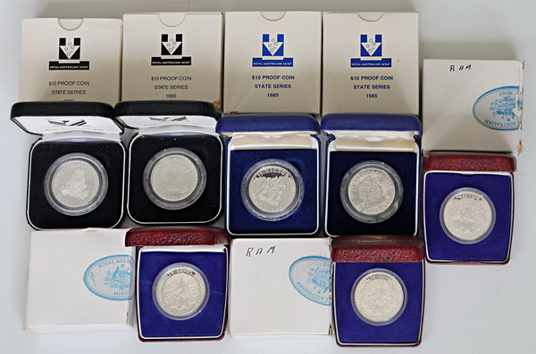 | Description: 1982 Commonwealth Games (3), 1985 State Vic (2), 1986 State SA (2) 10 Dollar silver Proof issues. In boxes of issue (some marks). (7 items total). FDC |