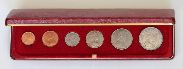 | Description: 1966 Mint set in dated RAM red hinged case; Inscribed on inner lid -Australian Decimal Coins - 14th February 1966-. Some tone, stains to inner case. Scarce. UNC |