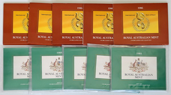 | Description: 1985 (5), 1986 (5) Mint sets. 1985 sets with clear plastic, a couple latter packs unglued and a few coins with very minor tone. High catalogue value. (10 items total). UNC |