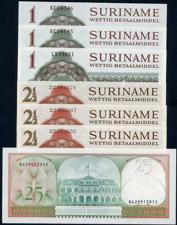 Suriname Dutch administration 1 Gulden 1974 (P 116d) pair and single, 2.5 Gulden 1961 (P 117a) ZZ prefix (3) and 25 Gulden 1982 (P 127a). (7 notes total).