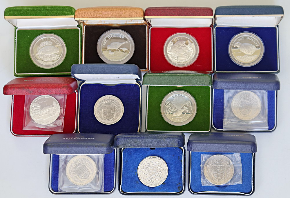 | Description: New Zealand set of 11 Proof silver Dollars, 1972-1986. Missing 1978, 1979, 1981, 1984. All in cases of issue, a few missing COAs but mostly nice condition. (11 items total). FDC |
