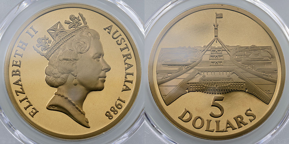 1988 Parliament House Proof al/br 5 Dollar. PCGS graded PR 69 DCAM (46203991).
