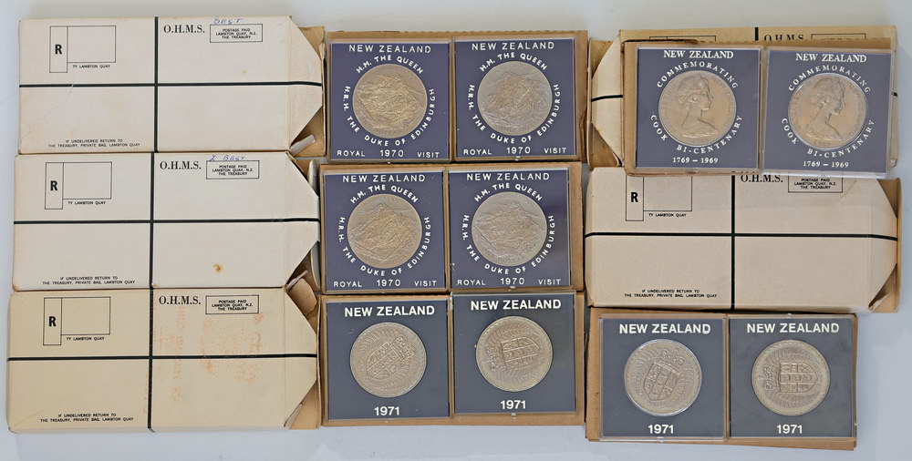 | Description: New Zealand large size 1 Dollar Unc issues in perspex cases: 1969 (2), 1970 (4), 1971 (4). Some with light tone. In original Treasury twin pack shippers from OHMS. (10 coins/5 items total). UNC |