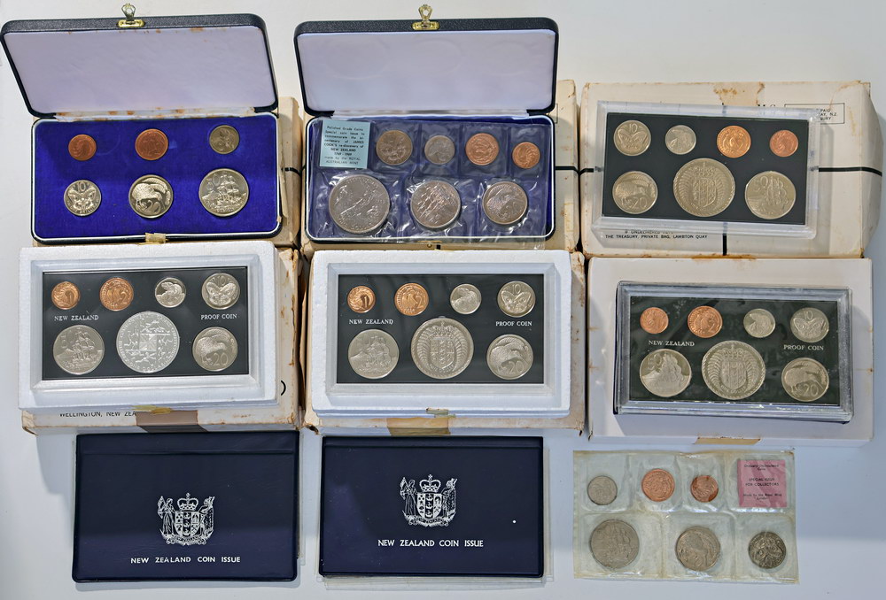 | Description: New Zealand Proof sets: 1968, 1971, 1972, 1974, 1975. Also Unc sets 1968 (in plastic), 1969 cased, 1972 (folder), 1974 (folder). Some coins toned, cases sticky. In old shippers. (9 items total). UNC-FDC |